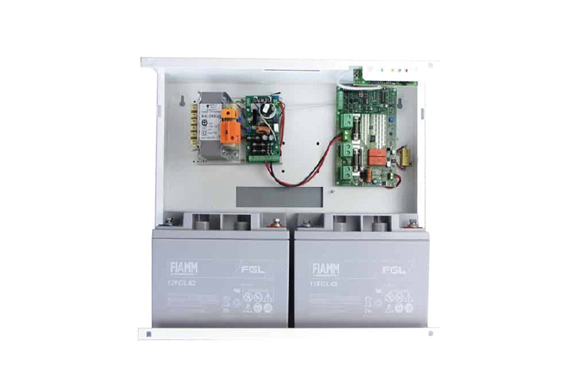 Unità di alimentazione ausiliaria per sistemi di antincendio con alimentatore a 27,6 Vdc.